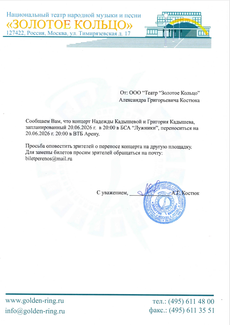 Уважаемый клиент! Спешим сообщить, что по информации, полученной от организатора, концерт Надежды Кадышевой, Григория Кадышева и ансамбля «Золотое кольцо», запланированный на 20 июня 2026 года в 20:00, в Олимпийском комплексе «Лужники», перенесен на ВТБ Арену. (г. Москва, улица Ленинградский проспект, дом 36) Билеты подлежат обмену на новую площадку. По всем вопросам обмена или возврата билетов обращайтесь, пожалуйста, к организатору мероприятия по следующим контактным данным: biletperenos@mail.ru С уважением, команда поддержки Ticketland