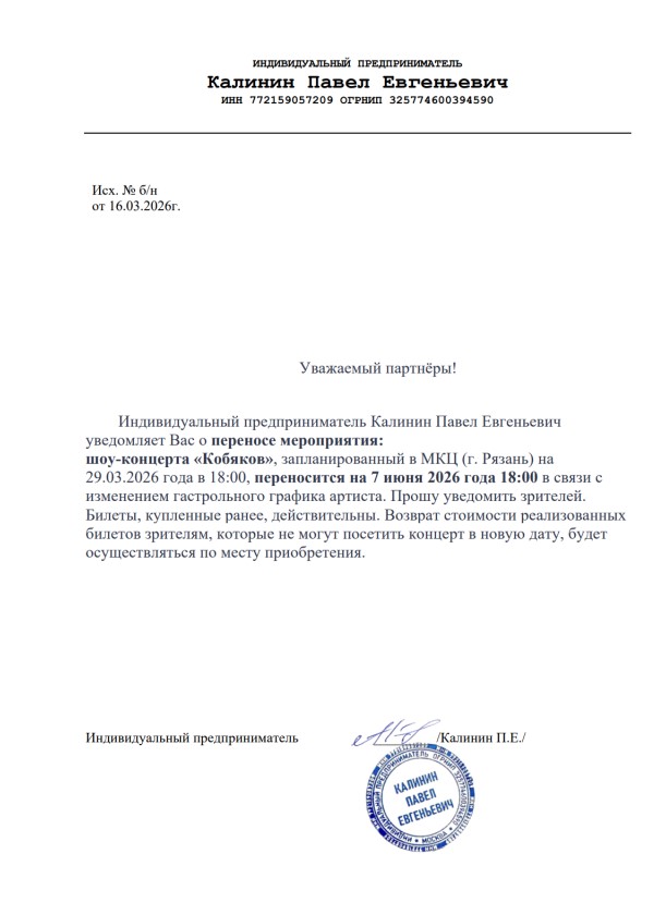 Уважаемый клиент! Спешим сообщить, что по информации, полученной от организатора, концерт Кобякова, запланированный на 29 марта 2026 года в 18:00 в МКЦ «Рязань», перенесён на 7 июня 2026 года в 18:00. Ранее приобретенные билеты действительны на новую дату, обменивать их не нужно. Если вам не удобно посетить концерт в новую дату, вы можете вернуть билет по кнопке в личном кабинете во вкладке «Заказы». Деньги за электронные билеты вернутся автоматически в полном объёме на карту, с которой была произведена оплата. Если вы купили билет в кассе Ticketland.ru за наличный расчет, то обратитесь, пожалуйста, на почту: vozvrat@ticketland.ru. С уважением, команда поддержки Ticketland.