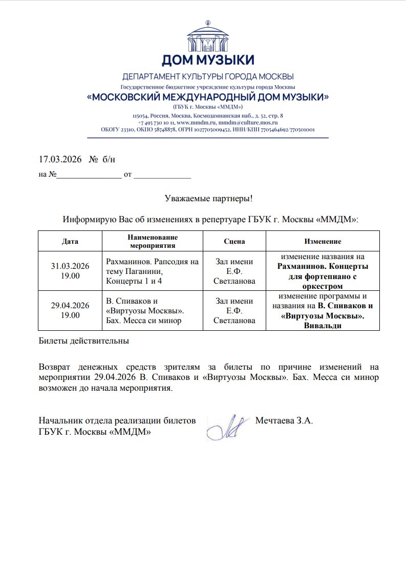 Уважаемый клиент! Спешим сообщить, что по информации, полученной от организатора, у концерт «Рахманинов. Рапсодия на тему Паганини, Концерты 1 и 4», запланированного на 31 марта 2026 года 19:00 в доме музыки, заменено название на концерт «Рахманинов. Концерты для фортепиано с оркестром». Программа концерта остается без изменений. Ранее приобретенные билеты действительны, обменивать их не нужно. С уважением, команда поддержки Ticketland