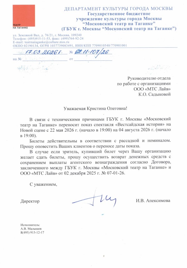 Уважаемый клиент! Спешим сообщить, что по информации, полученной от организатора, спектакль «Вестсайдская история», запланированный на 22 мая 2026 года в 19:00 в театре на Таганке, перенесён на 4 августа 2026 года в 19:00. Ранее приобретенные билеты действительны на новую дату, обменивать их не нужно. Если вам не удобно посетить мероприятие в новую дату, вы можете вернуть билет по кнопке в личном кабинете во вкладке «Заказы». Деньги за электронные билеты вернутся автоматически в полном объёме на карту, с которой была произведена оплата. Если вы купили билет в кассе Ticketland.ru за наличный расчет, то обратитесь, пожалуйста, на почту: vozvrat@ticketland.ru. С уважением, команда поддержки Ticketland