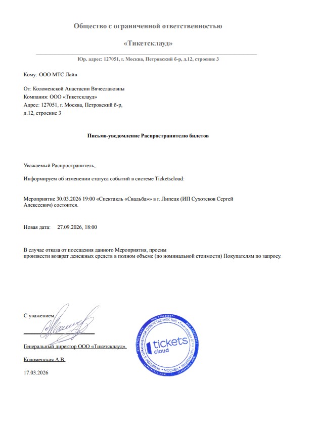 Уважаемый клиент! Спешим сообщить, что по информации, полученной от организатора, спектакль «Свадьба», запланированный на 30 марта 2026 года в 19:00 в ОЦКНТ, перенесен на 27 сентября 2026 года в 18:00. Ранее приобретенные билеты действительны на новую дату, обменивать их не нужно. Если вам не удобно посетить мероприятие в новую дату, вы можете вернуть билет по кнопке в личном кабинете во вкладке «Заказы». Деньги за электронные билеты вернутся автоматически в полном объёме на карту, с которой была произведена оплата. Если вы купили билет в кассе Ticketland.ru за наличный расчет, то обратитесь, пожалуйста, на почту: vozvrat@ticketland.ru. С уважением, команда поддержки Ticketland.